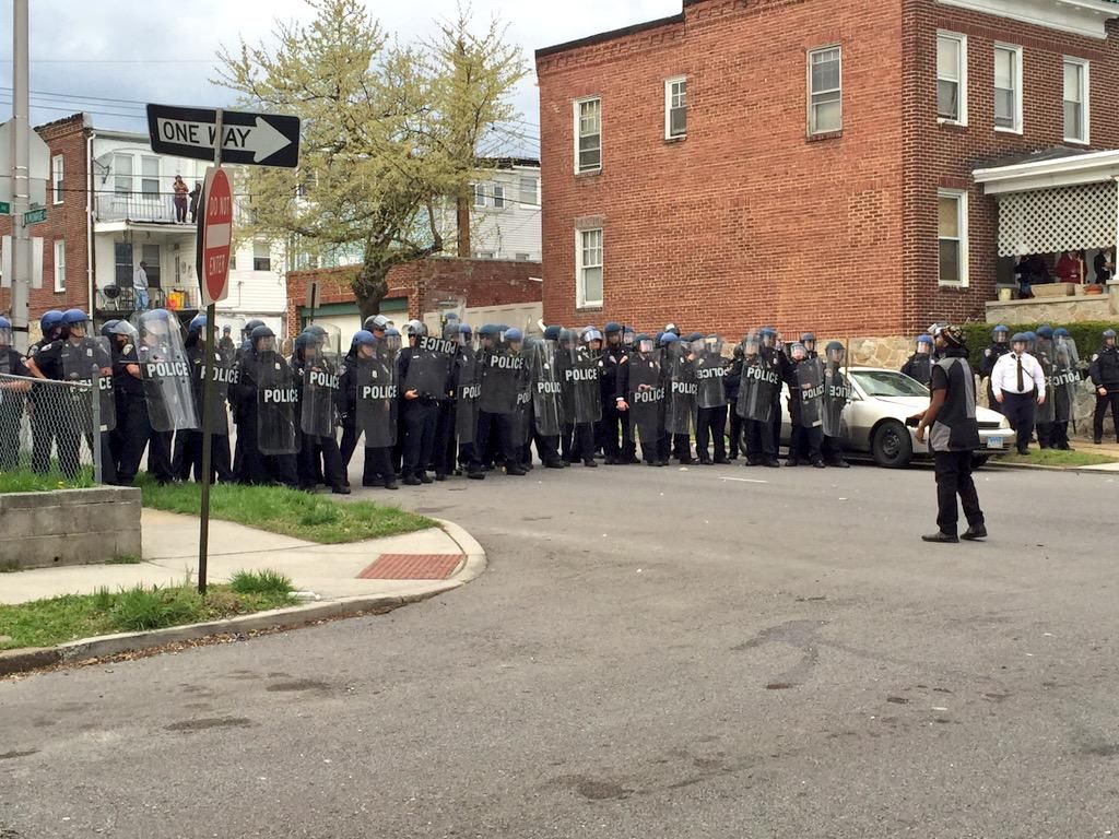 : Standoff. Police keep pepper spraying this unarmed man. And he remains still. Mondawmin.