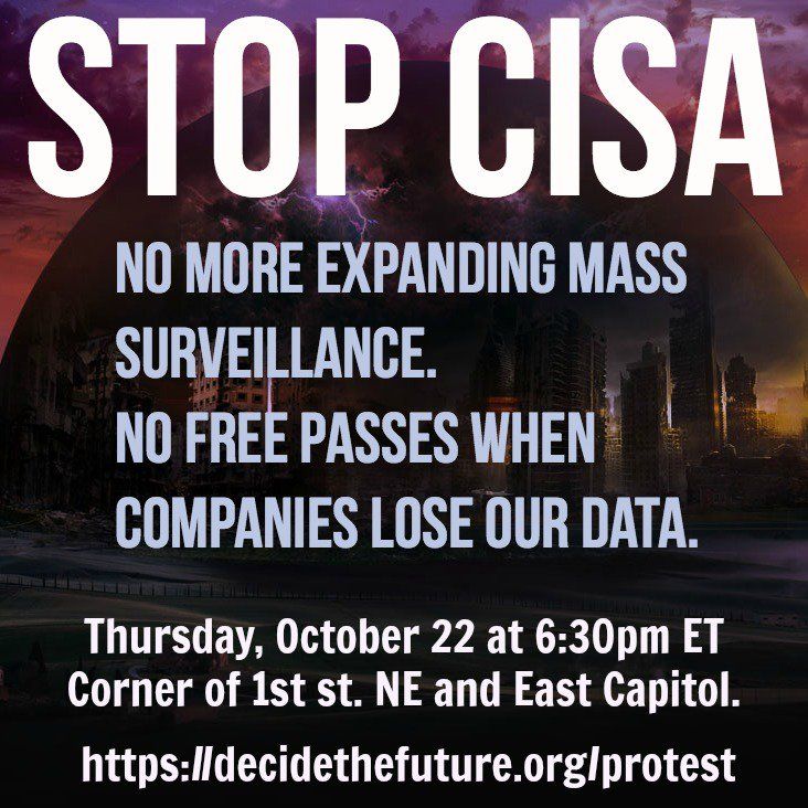 Today! Stop CISA protest on 1st NE & E. Capitol in D.C. Take a stand to stop surveillance & irresponsible infosec.